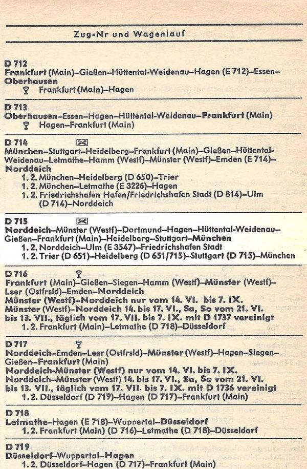 In der Gegenrichtung mit D 714, der ebenfalls über die Ruhr-Sieg Strecke fuhr, wurde bereits damals Hagen umfahren. Genau wie jetzt für die neue IC-Linie über die Ruhr-Sieg Strecke geplant. Mit dem Unterschied, dass es nach Hagen ab Letmathe einen Kurswagen gab.