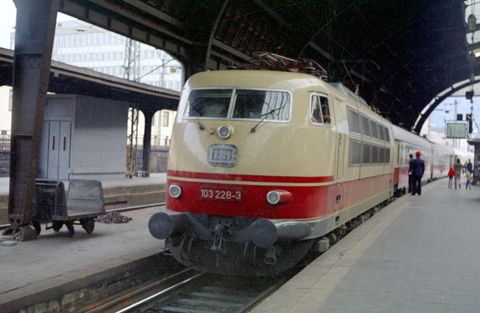 Ich habe 103 228-3 des Bw Hamburg-Eidelstedt vor IC Nymphenburg nach Hannover im Hagener Hauptbahnhof auf meinem ersten Spiegelreflex-Foto verewigt.