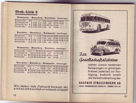 Durch diese Verzögerungen im Betriebsablauf lernte ich leider nicht mehr das Quietschen der Wagen der Linie 9 der Hagener Straßenbahn AG kennen, wenn sie von der Augustastraße in die Bachstraße abbogen. An der Ecke beim Frisör Müller vorbei, die leichte Steigung am Milchgeschäft Rose entlang, bis zur Kreuzung mit der Linie 8 auf der Lange Straße. Dort wo der Kohlenhändler Fritz Grote, die Weinhandlung Sybille Schmitz, der Bäcker Kabs und der Fleischer Kürsch den Wehringhausern ihre Waren anboten.