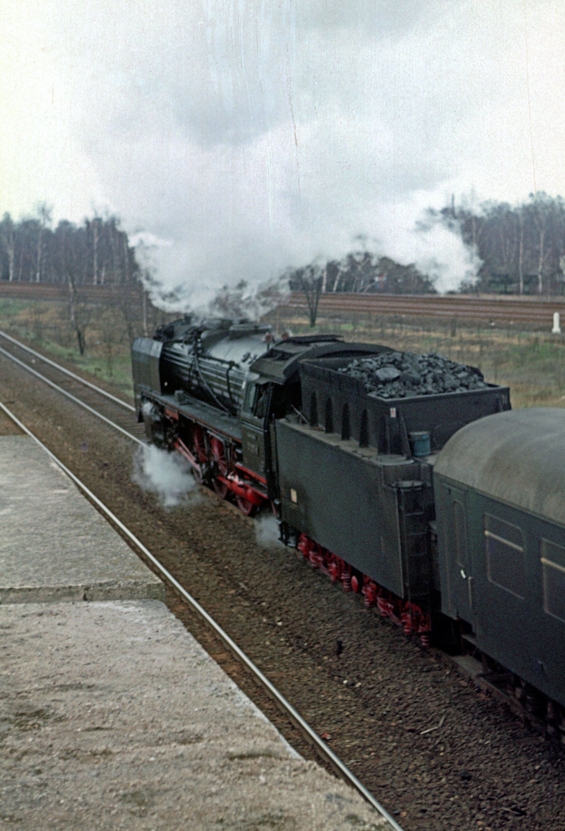 The photo was taken on April 8, 1977 in what was then the eastern part of Berlin near Wuhlheide station. Before engine 01 2137-6, which goes into the city, the bearing of the defunct bridge can be seen from the connecting curve from the Biesdorfer Kreuz towards Karlshorst.