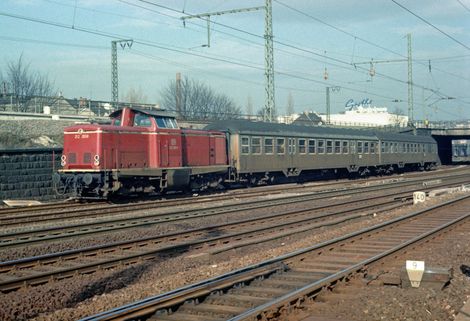 Mit einer "Fotoklick-Kamera" habe ich die ersten Eisenbahnbilder auf Kassettenfilm aufgenommen, wie z. B. im Herbst 1969 das Bild eines der letzten planmäßig mit Dampflok bespannten Reisezüge, hier mit 023 014-4 vor der Ausfahrt auf die Obere Ruhrtalbahn in Richtung Warburg.