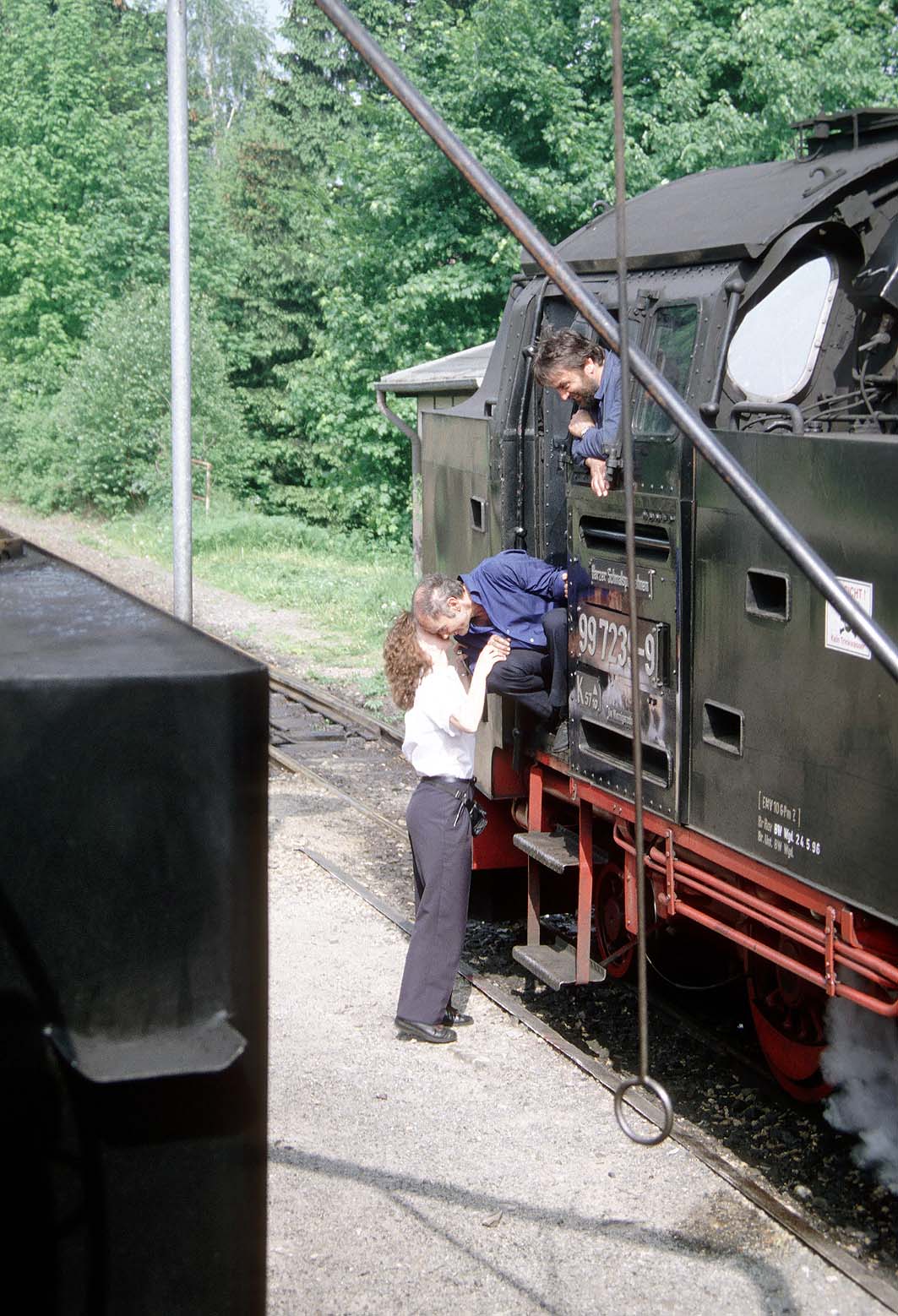 Here in Drei Annen Hohne is in full swing. Next to our train with 99 6001-4 engine 99 7244-9 with train 8939 from Wernigerode to Brocken is pulling into the station. On the other side of the track is 99 7239-9, which had come by train from the Brocken. After a short staff meeting in front of the 99 7239-9, it goes down to Wernigerode, where the train runs through the narrow streets in the direction of Wernigerode Westerntor.